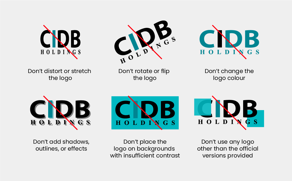 Consistent presentation of the CIDB Holdings brand strengthens recognition and trust. To maintain a unified identity, please avoid the following common mistakes: